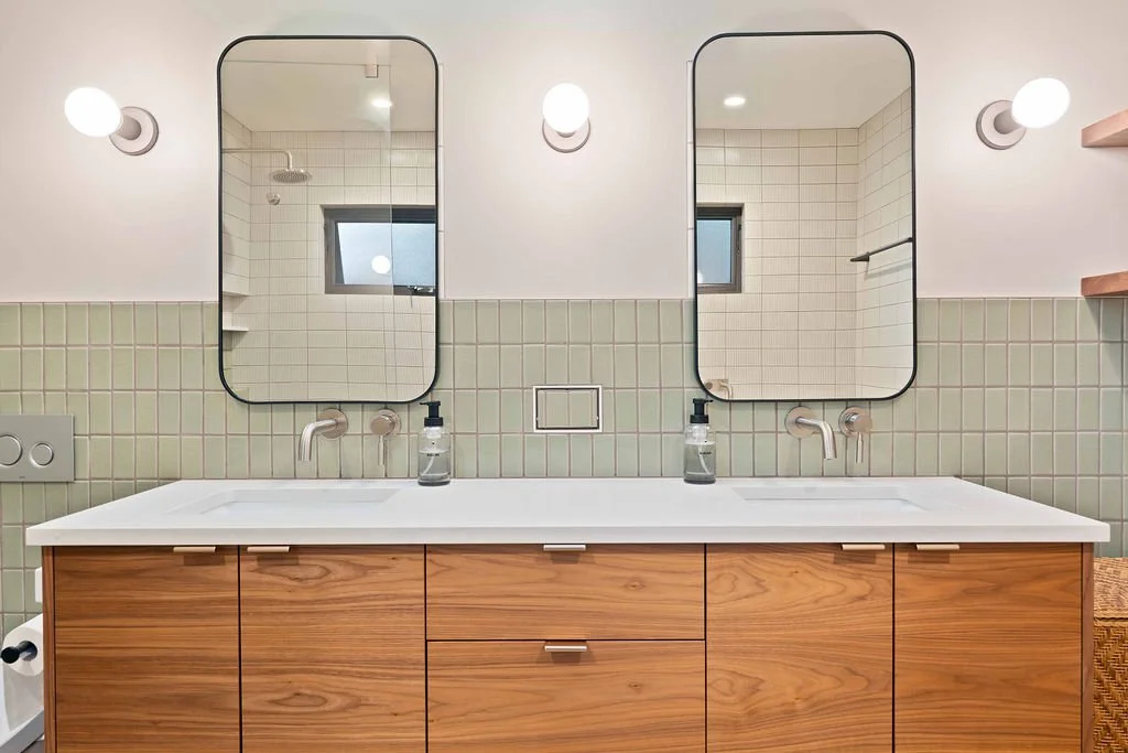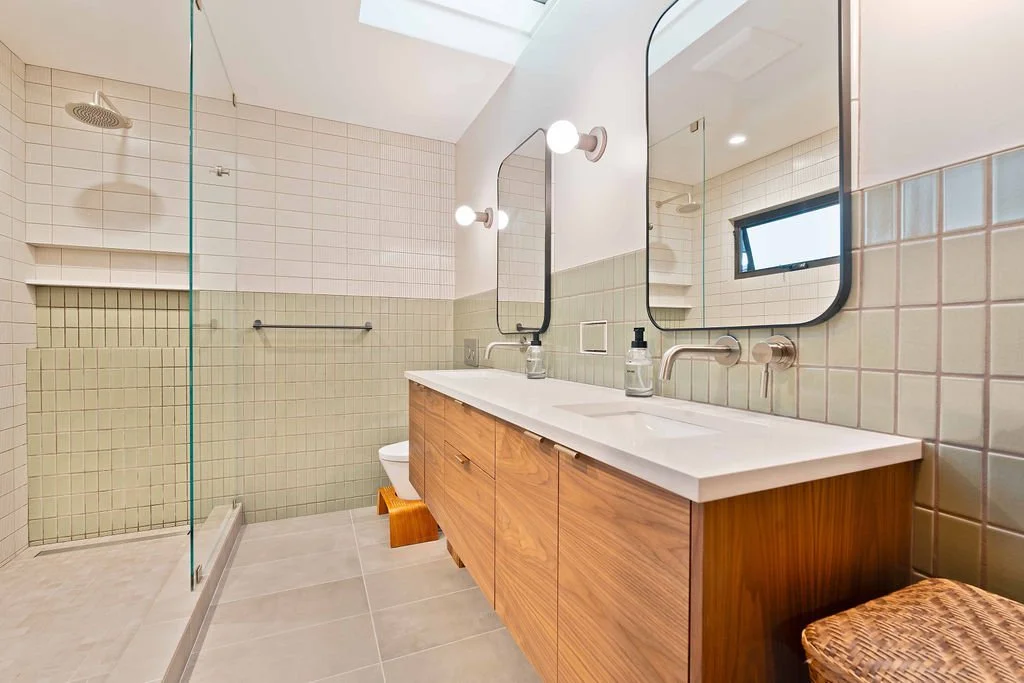A modern bathroom remodel for a Marin home. Featuring double sinks with their own mirrors, half-tile and full tile walls, a freestanding tub, and walk in shower, this elegant and functional bathroom fits perfectly with the home’s style.