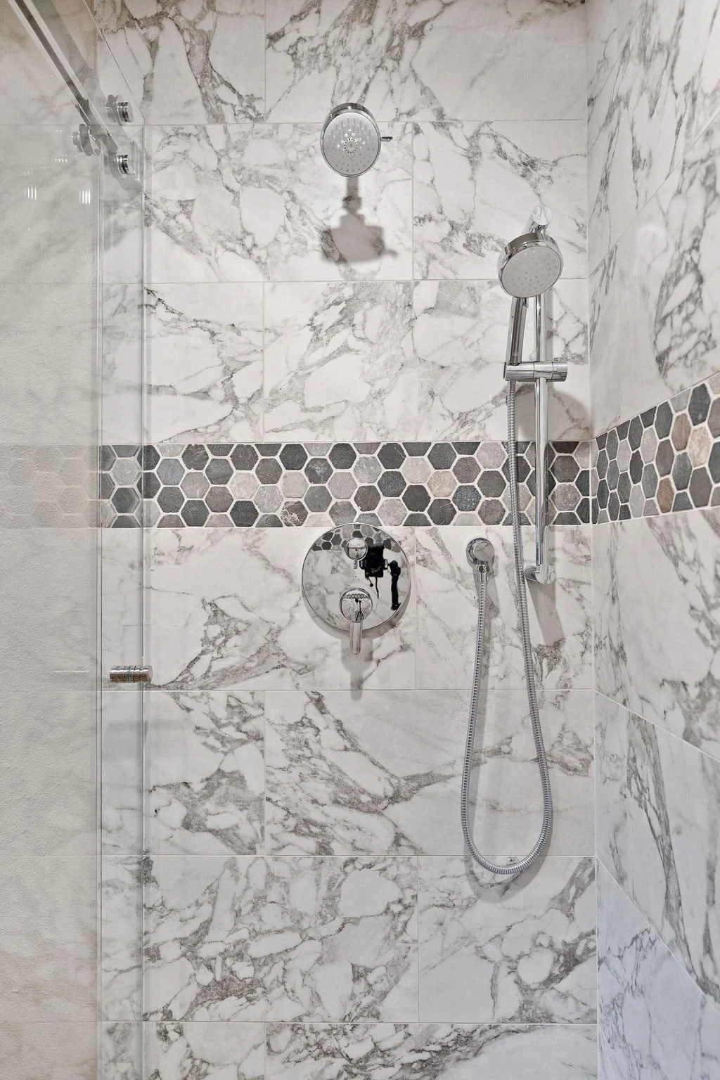 The showstopping marble shower is accented with hexagonal tile in a range of complimentary shades. A recessed shower niche is clad in a lightly contrasting, striped hexagonal tile, creating a harmonious effect for the walk-in shower. A classic, freestanding vanity sink with marble top offers plenty of space to prepare for the day.